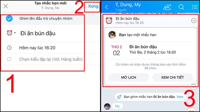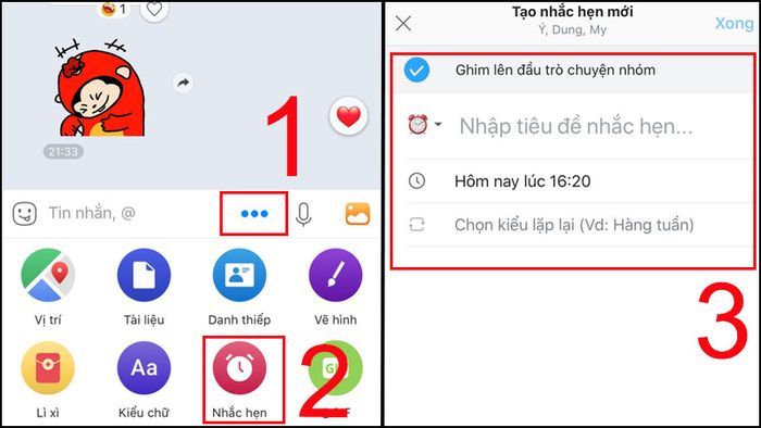 Bước 2: Trong cuộc trò chuyện nhóm, nhấn vào biểu tượng ba chấm > Chọn Nhắc nhở hẹn > Nhập thông tin lịch hẹn.