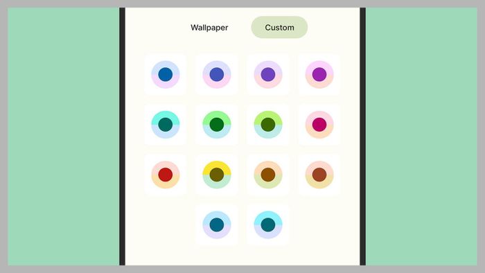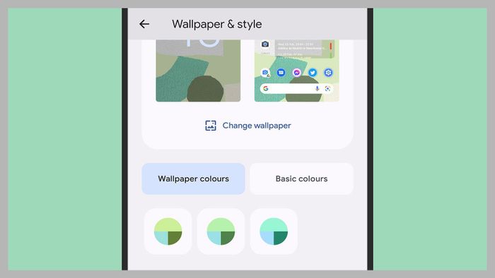 Dưới phần xem trước hình nền, bạn có hai lựa chọn: Màu sắc hình nền và Màu sắc cơ bản. Chọn Màu sắc hình nền và bạn sẽ có một loạt bảng màu phù hợp với hình ảnh hình nền bạn đã chọn, và những gam màu này sau đó sẽ được áp dụng trên toàn hệ điều hành cho menu, biểu tượng, tiện ích và nhiều hơn nữa.