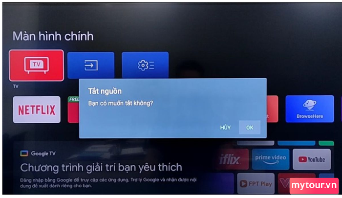 Thực tế, cách bật chế độ an toàn trên tivi TCL hoặc nhiều hãng tivi khác khá tương đồng. Dưới đây là hướng dẫn chỉ trong 3 bước đơn giản:- Bước 1: Sử dụng điều khiển, nhấn và giữ nút Power trong khoảng từ 3 đến 5 giây. Sau khoảng thời gian này, màn hình tivi sẽ hiển thị Power Off (Tắt nguồn). Trong một số hệ điều hành, màn hình có thể hiển thị Cancel (Hủy) hoặc Restart (Khởi động lại). Nếu có, bạn có thể chọn Restart để khởi động lại tivi.
