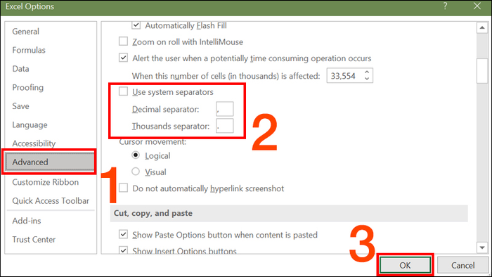 Đánh dấu vào Sử dụng Dấu Ngăn Cách 1000 và Đặt Số Thập Phân là 0