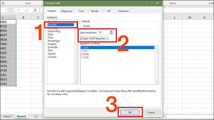 Khâu 2: Chọn Số tại thẻ Số > Đánh dấu vào Sử dụng Dấu Ngăn Cách 1000 > Đặt Số Thập Phân là 0 > Nhấn Đồng Ý.