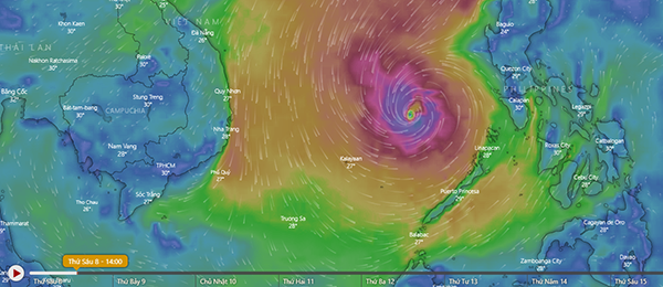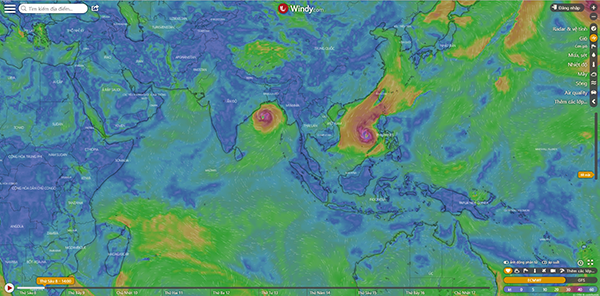 Ở góc dưới của giao diện có nút Play. Nhấn vào đây, bạn có thể theo dõi hướng di chuyển của cơn bão qua từng ngày. Ngoài ra, thông tin về hướng gió, tốc độ gió, sóng biển,... cũng được cập nhật đầy đủ.