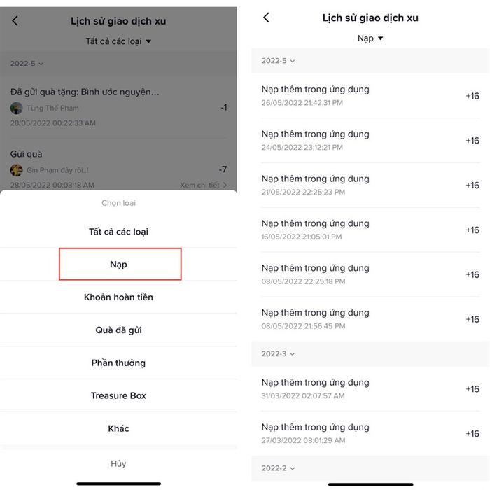 Bước 5: Chọn Nạp để theo dõi toàn bộ lịch sử và số xu nạp thành công!