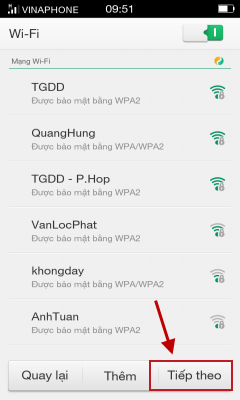 3/ Kết nối Wi-Fi -> Tiếp theo