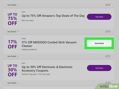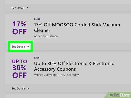 - Bạn có thể nhấp vào mã giảm giá để xem. Với hầu hết mã giảm giá của một số thương hiệu cụ thể (ví dụ: giảm 3 đô la cho sản phẩm Sony), tất cả sản phẩm có thể áp dụng mã giảm giá sẽ hiển thị. Với những mã giảm giá khác dành cho sản phẩm cụ thể, khi bạn nhấp vào mã giảm giá, trang sản phẩm sẽ hiển thị với mã khuyến mãi màu xanh lá cây hiển thị bên cạnh nhãn 'Mã Giảm Giá'.