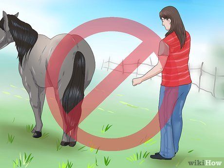 - Giữ khoảng cách an toàn khi ở phía sau hoặc bên cạnh của ngựa. Tùy thuộc vào kích thước của ngựa, khoảng cách này có thể thay đổi, vì vậy hãy để cho ngựa có đủ chỗ, đặc biệt là khi ở ngay phía sau nó.