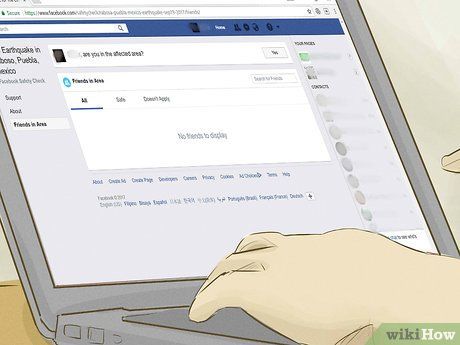 Sử dụng tính năng Kiểm tra An toàn của Facebook. Sử dụng công cụ tìm kiếm để tìm “Kiểm tra An toàn Facebook” và khu vực và loại thảm họa, chẳng hạn như, “Kiểm tra An toàn Facebook động đất Mexico.” Nhấp vào liên kết, nơi có thể đề cập đến điều gì đó như “Động đất tại Mexico.” Nhấp vào liên kết ở phía bên trái có ghi là “Bạn bè ở Khu vực.” Nếu người đó là bạn trên Facebook, bạn sẽ biết được họ đã đánh dấu mình là an toàn, hoặc chưa phản hồi.