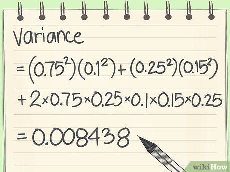 - Đối với ví dụ này, phương sai sẽ được tính toán như (0.75^2)(0.1^2) + (0.25^2)(0.15^2) + 20.750.250.10.15*0.25 = 0.008438.