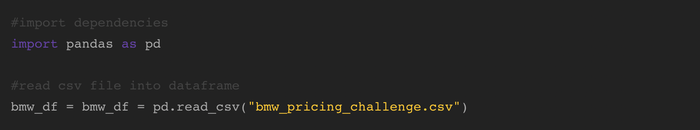 Ví dụ sử dụng Pandas sử dụng bộ dữ liệu Thách thức Giá xe BMW từ Kaggle, có thể tải miễn phí. Bắt đầu bằng cách nhập thư viện Pandas, sau đó đọc tệp CSV vào một khung dữ liệu Pandas: