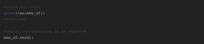 Displaying the first rows using bmw_df.head()Tìm phương sai cho dữ liệu BMW