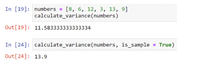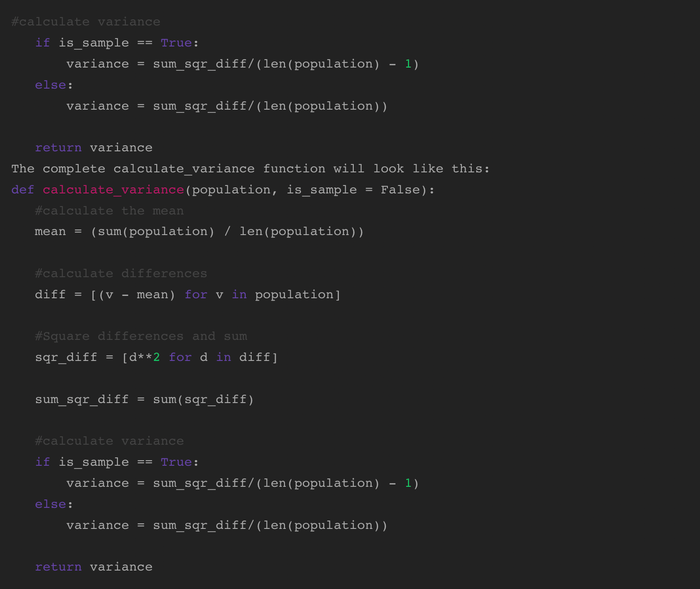 Cuối cùng, tính toán phương sai. Sử dụng câu lệnh If/Else, chúng ta có thể sử dụng tham số is_sample. Nếu is_sample là true, tính toán phương sai bằng (n-1). Nếu nó là false (giá trị mặc định), sử dụng N: