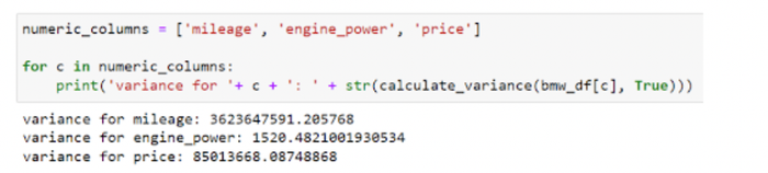 Vì bộ dữ liệu BMW có 4843 hàng, tính toán bằng tay sẽ...không vui. Thay vào đó, chúng ta có thể đơn giản là đưa cột từ khung dữ liệu vào hàm calculate_variance của chúng ta và trả về phương sai. Hãy tìm phương sai cho các cột số như mileage, engine_power và price.