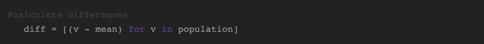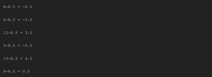 Sau khi tính toán giá trị trung bình, tìm sự chênh lệch từ giá trị trung bình cho mỗi giá trị. Bạn có thể thực hiện điều này trong một dòng sử dụng list comprehension.