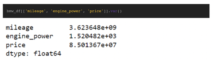 Variance for numeric columns in the BMW data frameSử dụng hàm var() của Pandas