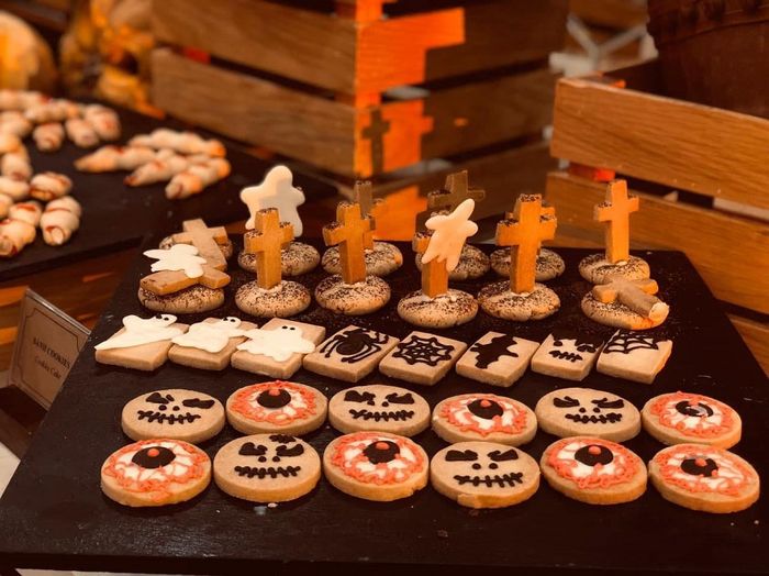 Một bữa tiệc kỳ quái cũng là cách trang trí Halloween độc đáo. Bạn có thể sử dụng tấm thảm màu trắng và bày trí các biểu tượng Halloween như quả bí đỏ, đầu lâu, bánh hình mạng nhện, bia mộ, và nhiều món ăn Halloween khác. Trên thảm còn có các quả bí ngô, đĩa bánh, và các món ăn Halloween để nhân viên cùng thưởng thức và cảm nhận không khí lễ hội.