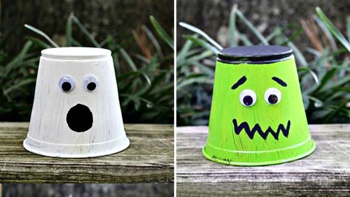 Để trang trí Halloween cho văn phòng bằng cốc nhựa giấy, bạn chỉ cần tô màu nước ra bên ngoài cốc, sau đó vẽ các biểu tượng Halloween, sinh động, tiếp đến bố trí thêm đèn LED bên trong là hoàn thiện sản phẩm của mình. Để chúng trở nên nổi bật hơn, bạn cần treo những chiếc cốc hoàn thiện vào nơi có ít ánh sáng.