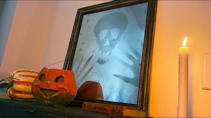 Với các văn phòng đầu tư nhiều về trang trí Halloween, bạn có thể sử dụng các tấm gương ma quái. Hầu hết cửa hàng trang trí sẽ có sẵn sản phẩm này, dễ dàng tìm kiếm. Tuy nhiên, nếu bạn muốn tiết kiệm, bạn có thể tận dụng một tấm kính và tạo hình với mực đỏ bằng cách viết chữ cái và vẽ những biểu tượng ma mị và Halloween. Sau đó, dán chúng lên tấm kính một cách dễ dàng.