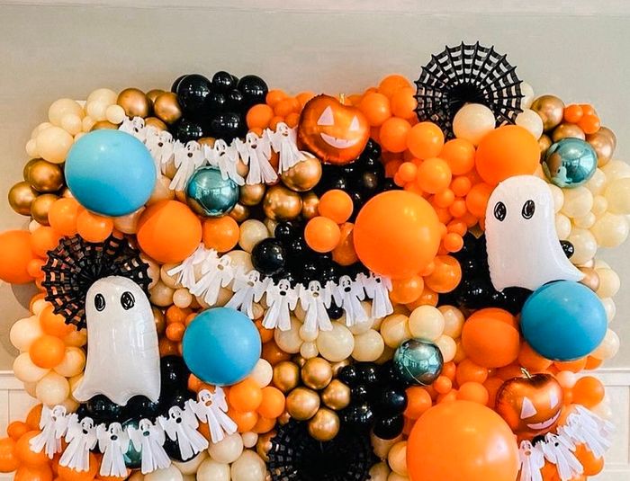 Sử dụng bong bóng để dán hình mèo đen, dơi, và nhẹn, sau đó trang trí khắp văn phòng. Phương pháp này tạo không gian Halloween sôi động mà không cần tốn kém.