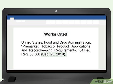 Bắt đầu mục Works Cited với tên của cơ quan hoặc văn phòng. Đối với các quy định trong Federal Register, bắt đầu với 'Hoa Kỳ' để xác định chính phủ liên bang. Đặt dấu phẩy sau 'Hoa Kỳ', tiếp theo thêm tên của bộ hoặc cơ quan chính phủ cụ thể đã ban hành quy định. Đặt một dấu chấm sau tên của cơ quan. Ví dụ: Hoa Kỳ, Cục Quản lý Thực phẩm và Dược phẩm.