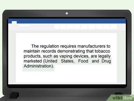 - Nếu bạn đã bao gồm tên của bộ hoặc cơ quan hành pháp trong văn bản của mình, bạn thường không cần phải có một trích dẫn trong ngoặc ở cuối câu. Ví dụ, bạn có thể viết: 'Sau các trường hợp tử vong do sử dụng thiết bị hút thuốc lá điện tử, Cơ quan Quản lý Thực phẩm và Dược phẩm Hoa Kỳ đã ban hành một quy định kiểm soát việc tiếp thị thiết bị hút thuốc lá điện tử.' Bởi vì bạn đã xác định cơ quan hành pháp trong câu, bạn sẽ không cần phải bao gồm một trích dẫn trong ngoặc.