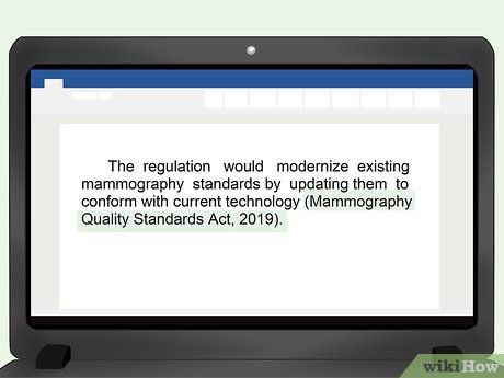 Sử dụng tên của quy định và năm để trích dẫn trong bản văn. Trích dẫn trong bản văn theo APA bao gồm phần đầu tiên của mục tham khảo và năm xuất bản. Thông thường, bạn sẽ đặt thông tin này trong ngoặc ở cuối bất kỳ câu nào bạn thảo luận về quy định, bên trong dấu câu kết thúc.