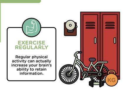 Ngủ ít nhất 8 tiếng mỗi đêm và tập thể dục 30 phút mỗi ngày. Bạn sẽ hoạt động tốt hơn trong lớp học và trong các bài kiểm tra và bài tập nếu bạn được nghỉ ngơi đầy đủ và khỏe mạnh. Chọn một hoạt động mà bạn thích cho việc tập thể dục và lên lịch cho nó giống như bạn lên lịch cho các buổi học, công việc và phiên học.