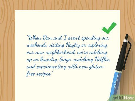- Ví dụ, bạn có thể viết về việc con bạn bắt đầu đại học, một chuyến đi cuối tuần bạn đã đi và sau đó thêm một hoặc hai câu về cuộc sống hàng ngày bình thường của bạn, như, “Khi Dan và tôi không dành thời gian cuối tuần của mình để thăm Hayley hoặc khám phá khu phố mới của chúng tôi, chúng tôi đang bắt kịp với việc giặt giũ, xem Netflix liên tục và thử nghiệm các công thức mới không có gluten.”
