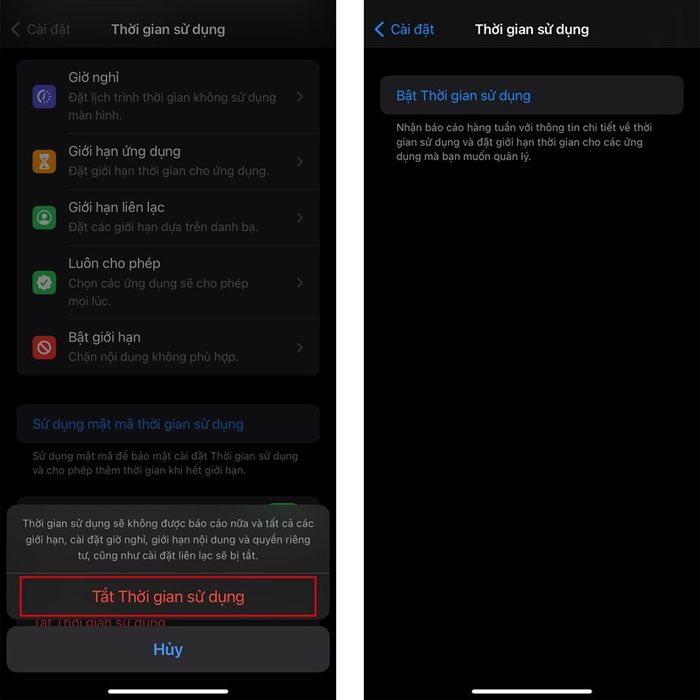 Bước 3: Khi có thông báo xác nhận xuất hiện, chỉ cần nhấn vào Tắt Thời gian sử dụng một lần nữa để hoàn tất. Hệ điều hành sẽ tắt tính năng đó và đưa bạn đến màn hình như trong hình bên phải.