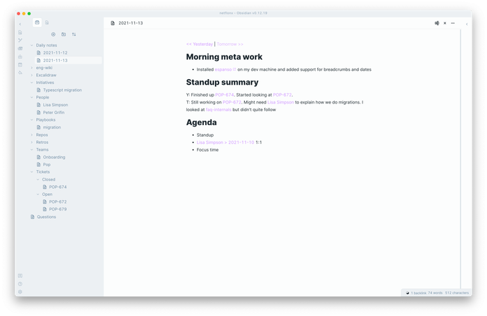 Obsidian có một tiện ích ghi chú hàng ngày rất hữu ích. Đầu tiên vào buổi sáng, tôi tạo một ghi chú hàng ngày, nhập lịch trình của mình từ Google Calendar (liên kết đến tất cả mọi người tôi sẽ gặp). Tôi luôn bao gồm một phần 'meta' để quan sát về cách hệ thống phục vụ cho tôi. Tôi cũng khuyến nghị tạo liên kết đến ngày kế tiếp và ngày trước đó.