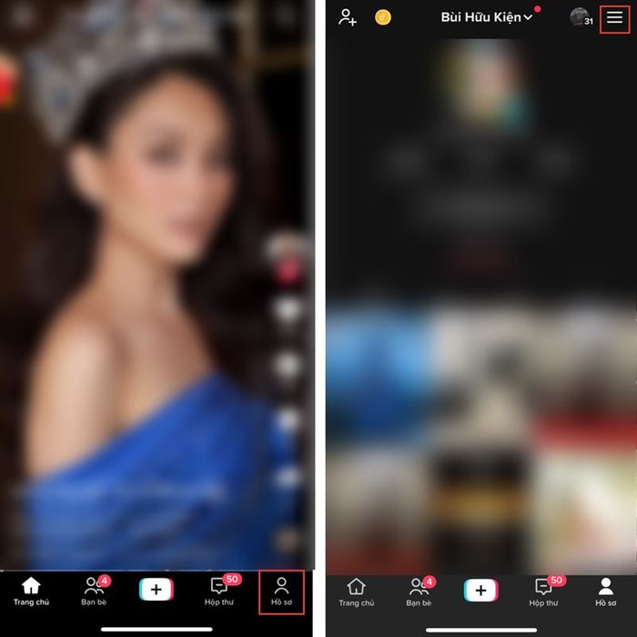 Bước 1: Mở ứng dụng TikTok, chọn tab Hồ sơ, sau đó nhấn vào biểu tượng 3 dấu gạch ngang ở góc trên bên phải màn hình.