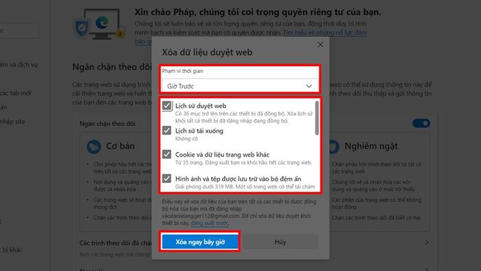 Bước 3: Điều chỉnh thời gian và chọn dữ liệu cần xóa, sau đó nhấn Xóa ngay bây giờ.