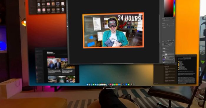 Khi phóng to màn hình, giới hạn kích thước 13 hoặc 15 inch của MacBook Air sẽ không còn là vấn đề. Bạn sẽ có màn hình siêu rộng trong kính, dễ dàng kéo thả cửa sổ ứng dụng và trình duyệt để làm việc.Việc “ném” giao diện màn hình MacBook vào không gian hiển thị của Apple Vision Pro cho phép bạn điều chỉnh để tạo workspace hoàn hảo, phù hợp với không gian xung quanh người đeo kính. Kỹ thuật xử lý hình ảnh foveated rendering giúp làm mờ chi tiết không quan trọng và độ phân giải 1080p khi ghi hình trông khá mờ.