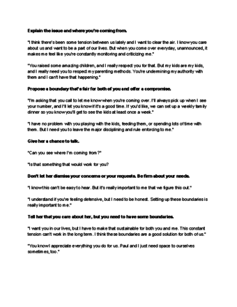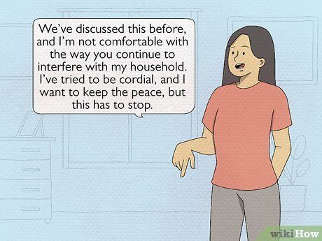 - Thiết lập ranh giới vững chắc với mẹ chồng của bạn bằng cách cho biết khi nào bà ấy có thể và không thể đến hoặc chỉ trích những bình luận không thích hợp.