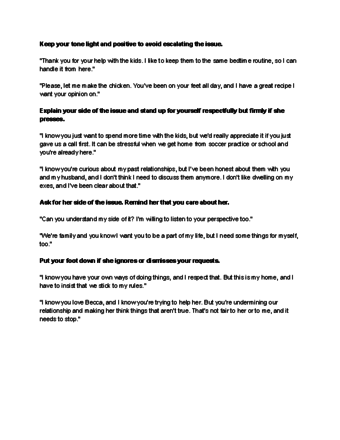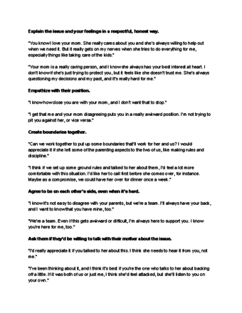 Cho biết với vợ/chồng bạn hiểu rằng họ đang ở trong tình huống khó khăn. Cho vợ/chồng biết rằng bạn hiểu được mức độ khó khăn khi ở giữa cuộc xung đột. Nhấn mạnh rằng mối quan hệ giữa bạn và vợ/chồng là riêng biệt với cuộc xung đột giữa bạn và mẹ chồng.