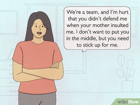 Diễn đạt cảm xúc của bạn với đối tác. Tôn trọng mối quan hệ của vợ/chồng với mẹ của họ, nhưng diễn đạt nhu cầu của bạn về không gian cá nhân và tự chủ. Làm cho nhu cầu của bạn rõ ràng và đặt tên cho các vấn đề cụ thể cần được giải quyết. Giữ cho ngôn từ tích cực và nhắc nhở đối tác của bạn rằng bạn không trách họ về hành động của mẹ của họ.