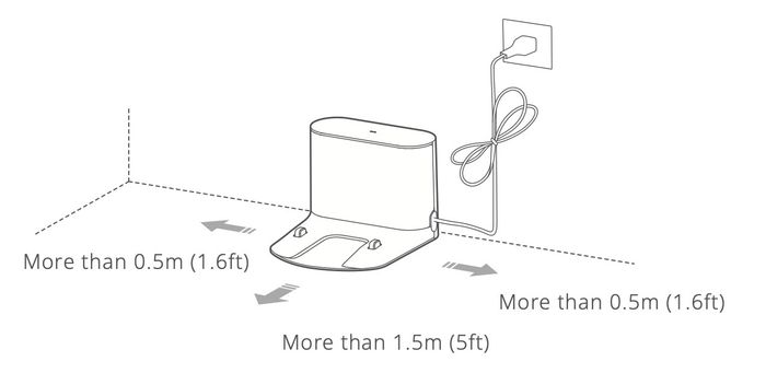 Tuy nhiên, khi để dock trong góc, bạn cần lưu ý rằng hai bên trái phải của dock phải cách tường ít nhất 50cm, và nếu bạn có góc nào đặc biệt thì khoảng cách về phía trước cũng phải tối thiểu 1,5m. Bạn có thể xem hình bên dưới, tôi chụp từ tài liệu hướng dẫn sử dụng của Roborock. Các hãng khác cũng thực hiện tương tự, khoảng cách cũng không khác gì.
