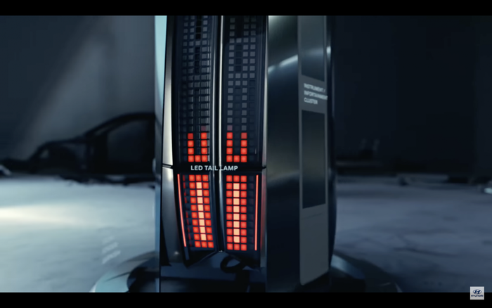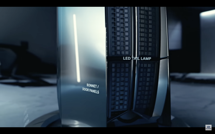 Thùng đựng được trang trí với đèn hậu LED pixelated của biểu tượng Ioniq 5 và màn hình đọc thông số kỹ thuật số.