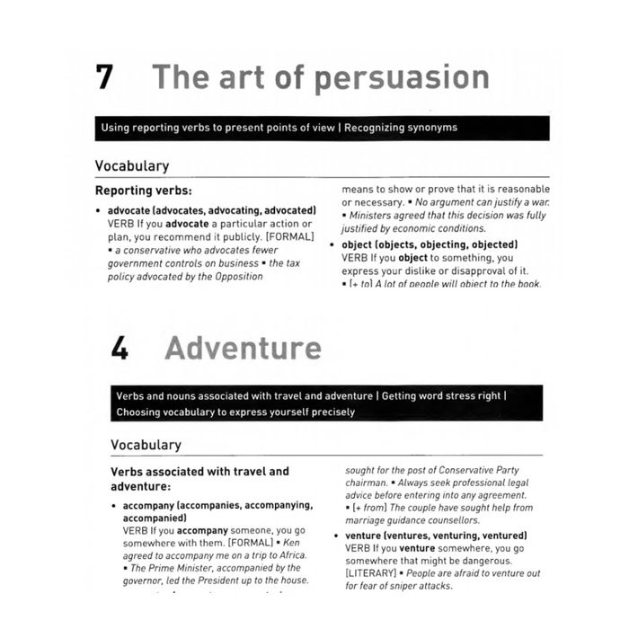 However, BARRON’S lacks a section on functional word groups such as issues, solutions... like CAMBRIDGE and COLLINS do. Particularly, COLLINS extensively employs units to address this matter.
