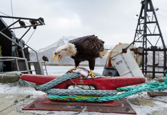 Những chú chim đặc biệt thích Dutch Harbor, nơi mà họ tự hào về việc bắt được nhiều cá hơn bất kỳ thị trấn cảng nào khác trong cả nước. Những con tàu cá đã kéo về 787 triệu pound cá pollack, cod, halibut, và cua vào năm 2015. Như bạn có thể tưởng tượng, điều đó thu hút đại bàng. Rất nhiều đại bàng.