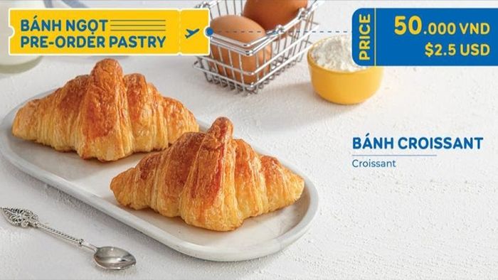 Bánh ngọt trong thực đơn đồ ăn trên máy bay Vietravel Airlines bao gồm những món bánh cơ bản như bánh croissant (bánh sừng bò), bánh bông lan phô mai, bánh su kem,... rất hấp dẫn. Nếu bạn là người yêu thích đồ ngọt, chắc chắn bạn sẽ say mê trước những món bánh xinh xắn đầy ngọt ngào này. Toàn bộ thực đơn bánh ngọt của Vietravel Airlines đều có giá đồng giá là 50.000đ.