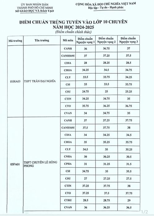 Điểm chuẩn vào lớp 10 chuyên các trường THPT năm 2024 tại TP.HCM (trang 1)