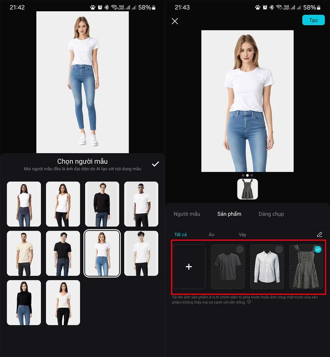Bước 3: Lựa chọn hình dáng người mẫu mà bạn muốn, sau đó chọn mục Sản phẩm để tải ảnh sản phẩm của bạn lên cho người mẫu thử trang phục.