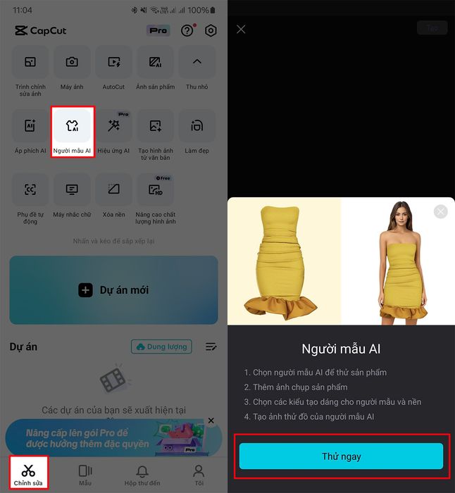 Bước 2: Trên trang chủ của ứng dụng, nhấn vào mục Chỉnh sửa > Tiếp tục chọn Người mẫu AI > Nhấn vào Thử ngay để bắt đầu.