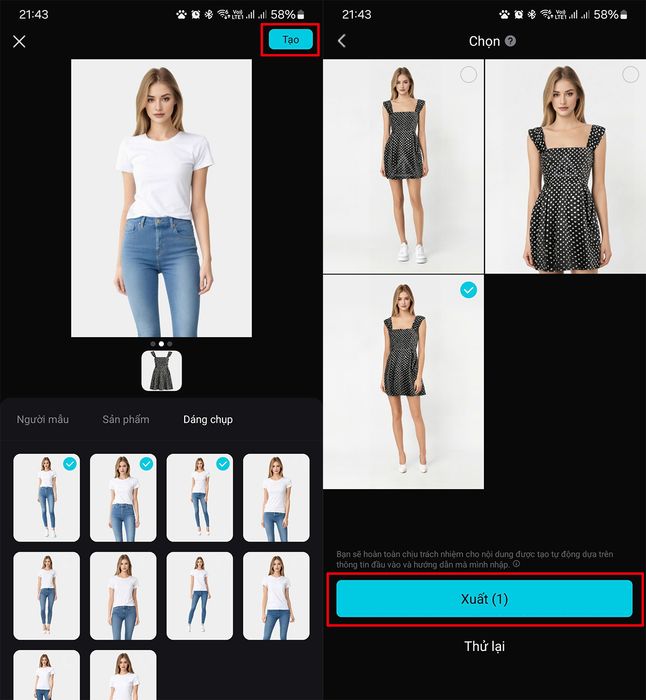 Bước 4: Chọn dáng chụp của người mẫu để hình ảnh thêm sinh động > Sau khi hoàn tất, nhấn vào Tạo > Chờ một lúc Capcut AI sẽ xử lý và tạo hình ảnh cho bạn. Lựa chọn ảnh yêu thích và nhấn Xuất để tải xuống là xong.