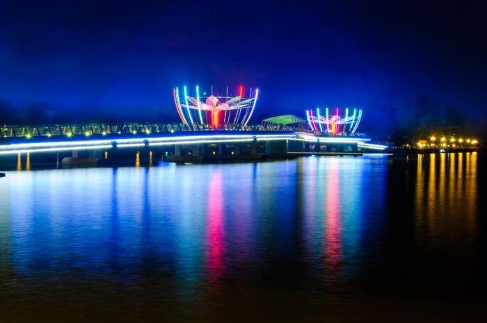Tham quan cầu đi bộ Ninh Kiều vào ban đêm thật sự thú vị. Khung cảnh về đêm tại đây tràn đầy sôi động và niềm vui. Khi thành phố thắp đèn, cầu tình yêu Cần Thơ trở nên rạng ngời với hệ thống đèn LED bao quanh lan can và đài hoa sen thay đổi màu sắc tỏa sáng. Tất cả tạo nên không gian huyền ảo và đẹp như trong mơ.