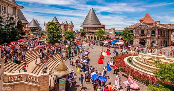 Bà Nà Hills sở hữu nhiều địa điểm “sống ảo” lộng lẫy, thu hút mạnh mẽ trên mạng xã hội như Cầu Vàng, Làng Pháp, Vườn Hoa Le Jardin D’Amour, Bảo Tàng Tượng Sáp và Hầm Rượu Debay, mang kiến trúc châu Âu tinh tế.