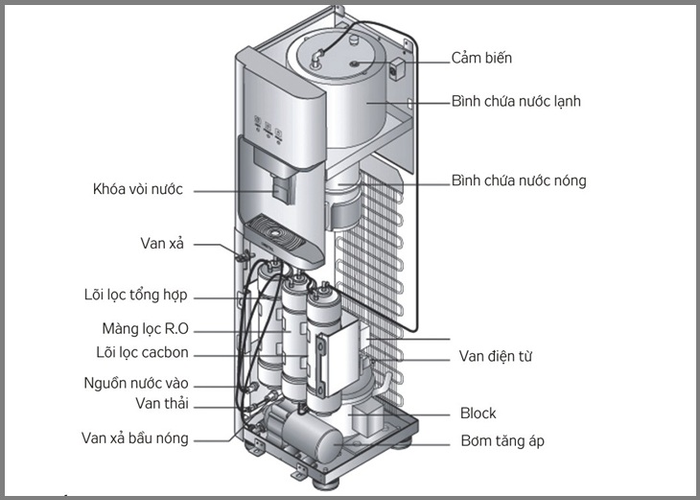 Để đảm bảo an toàn, độ bền và tiết kiệm điện, hầu hết các cây lọc nước nóng lạnh hiện nay đều sử dụng công nghệ block thay vì chip điện tử. Cấu trúc máy thường bao gồm các thành phần như:
