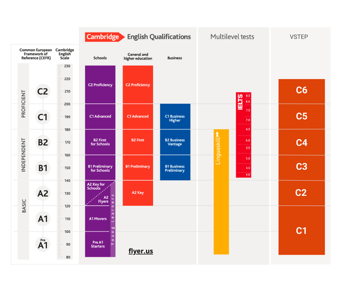 Các cấp độ bao gồm A1 Movers (dành cho trẻ em), A2 Flyers (dành cho trẻ em)/KET (dành cho thanh niên), B1 PET (dành cho thanh niên/người đi làm), B2 FCE (dành cho thanh niên/người đi làm), C1 CAE và C2 CPE (dành cho thanh niên/người đi làm).