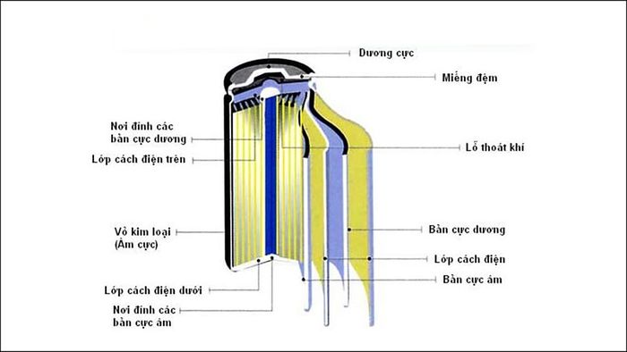 Cell pin thường có 4 bộ phận chính. Nguồn: Internet.- Bộ phân tách (màng cách điện): Chế tạo từ nhựa PE hoặc PP, ngăn cách giữa cực âm và cực dương. Có lỗ nhỏ giúp Ion Li+ di chuyển.