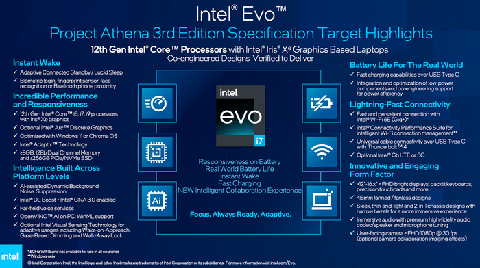 Với tiêu chuẩn mới Evo 3.0, ngoài các tiêu chuẩn đã biết trước đó ở thế hệ đầu tiên, laptop ultrabook muốn đạt tiêu chuẩn Evo 3.0 phải có webcam độ phân giải ít nhất 1080p, microphone AI khử ồn để học tập và họp hành rõ ràng hơn, kết nối Wi-Fi 6E. Đối với laptop sử dụng chip H hiệu suất cao, máy phải trang bị GPU rời Arc của Intel (sẽ ra mắt thương mại trong thời gian sắp tới), đáp ứng nhu cầu của những người sáng tạo. Tuy nhiên, không nên kỳ vọng thấy nhãn Intel Evo trên laptop gaming, vì chúng thường sử dụng GPU của NVIDIA hoặc AMD.